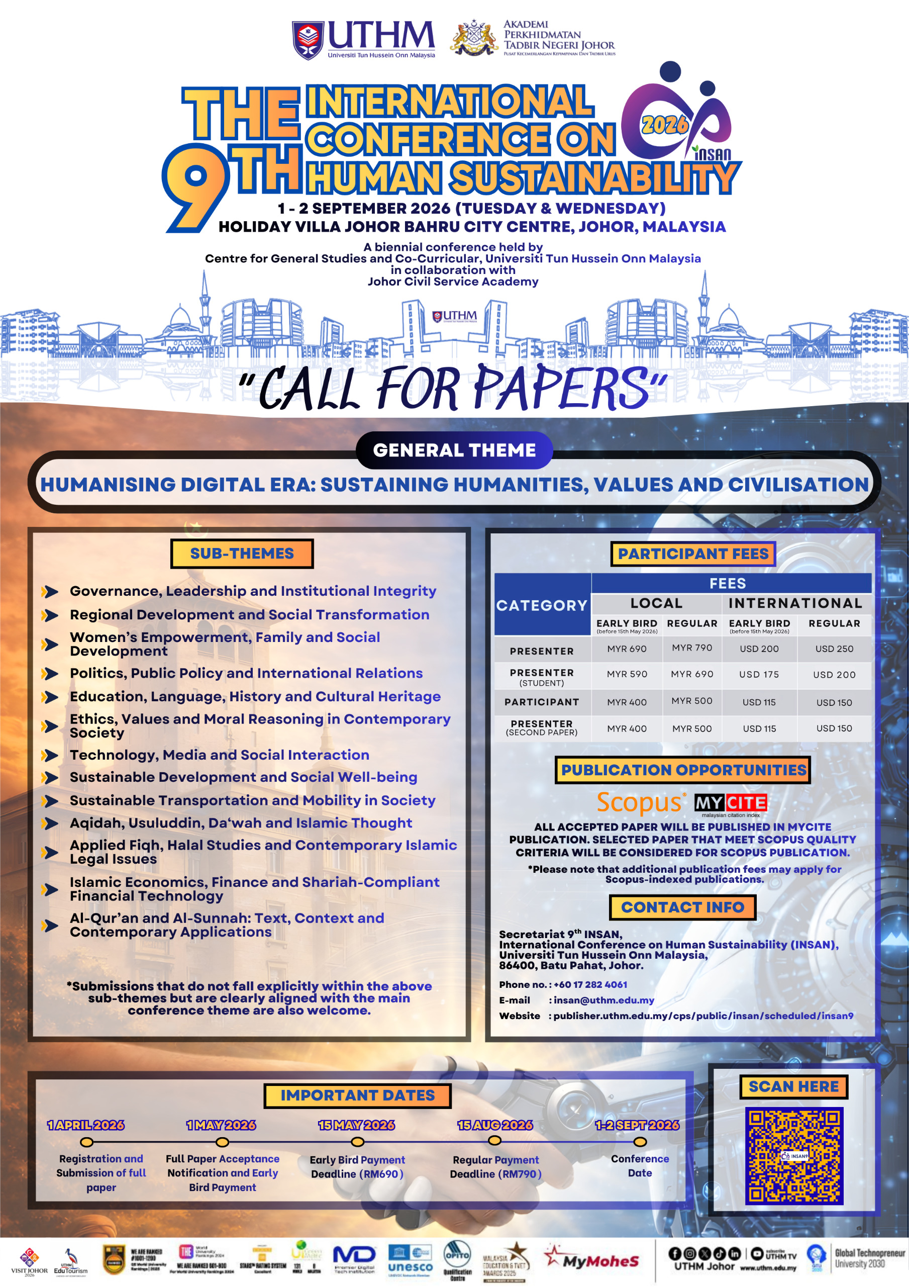 The International Conference on Human Sustainability (INSAN) was established in response to the growing need to address future issues and challenges related to human sustainability through multidisciplinary perspectives in the social sciences and humanities. Since its inception, INSAN has been successfully organized in 2014, 2015, 2016, 2017, 2018, 2020, 2022, and 2024, attracting more than 1,000 participants and presenters from countries including Malaysia, Indonesia, Brunei, Thailand, Japan, Nigeria, Italy, Iran, and Iraq.